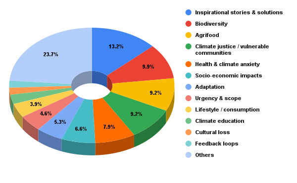 Their feedback shows: Existing solutions and positive, inspiring stories are at the top of the list and an overarching aspect of under-reported climate change topics. Incidentally, a recent study involving 59,000 participants confirmed that pessimism may actually be counterproductive. This is followed by effects on biodiversity/biosphere and the consequences for the climate, agriculture/livestock/food, climate justice, health and mental health, socio-economic impacts, adaptation, urgency and scope of the crisis, lifestyle and consumption, climate education, cultural loss, and feedback loops. By the way, making the agrifood system a priority in national strategies to address climate change has taken center stage at COP28 for the first time. Unfortunately, there were no meaningful results, while FAO’s roadmap for the transformation of agrifood systems falls short by significantly understating the impact of the livestock industry, focusing on inflated technological solutions.